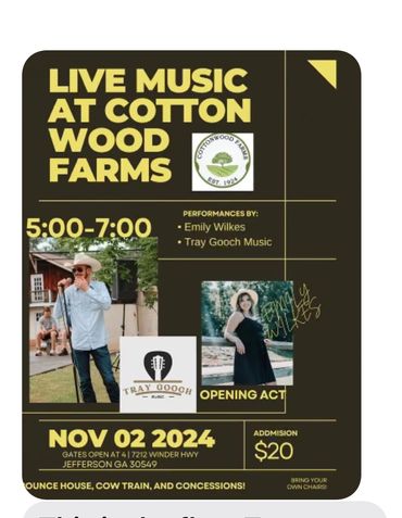 We are ending our Pumpkin Season with first "Music on the Farm" Event! Tray Gooch will be performing country & gospel music live Sat Nov 2nd...